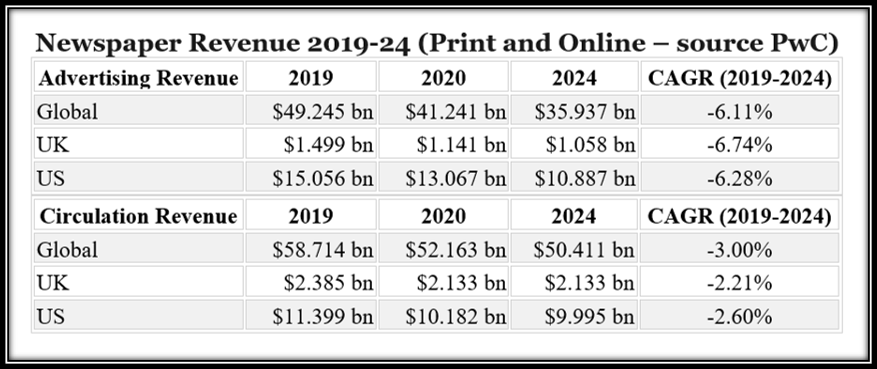 Las cifras muestran que, a nivel mundial y nacional, los ingresos por impresión seguirán cayendo más rápido y más de lo que el crecimiento digital puede compensar, aunque esto es menos pronunciado en el Reino Unido que en los EE. UU.