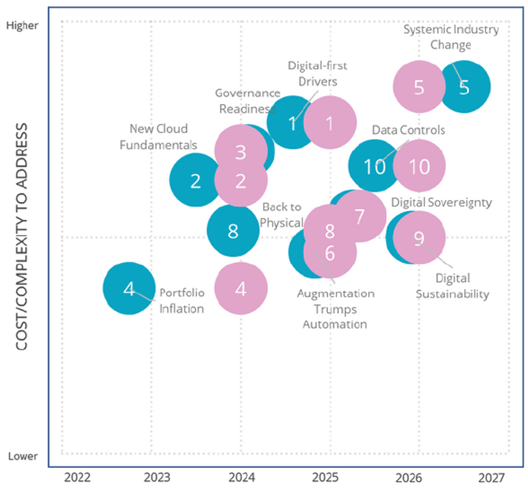 (5) Para 2025, los líderes de la industria que se enfrenten a transiciones sistémicas u obligatorias en la próxima década duplicarán el gasto en TI para entornos nuevos, pero lucharán por lograr las ganancias esperadas en la eficiencia operativa de TI.