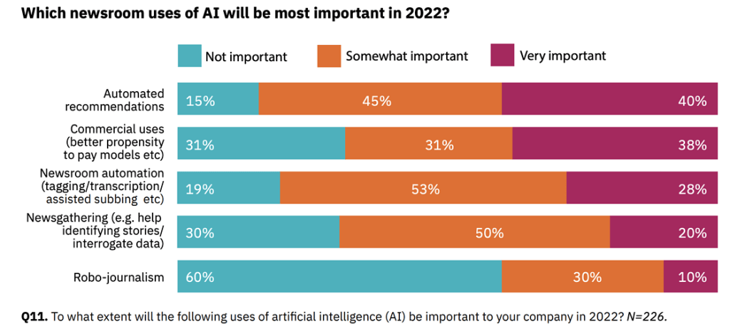 Este año marcó un hito y, por primera vez, la encuesta mencionó el periodismo robótico como un posible uso de la Inteligencia Artificial en las salas de redacción con un al menos 40 % de los líderes pensando que es importante o algo importante en 2022.