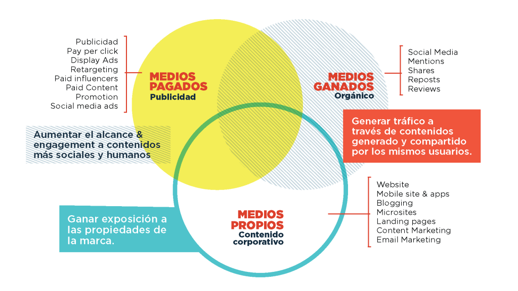 Por último los medios ganados, que son algo así como el aprovechamiento del hacer las cosas bien y que generan tráfico a consecuencia de lo que comparten terceros. Todo eso que pasa en el mundo de las redes sociales.