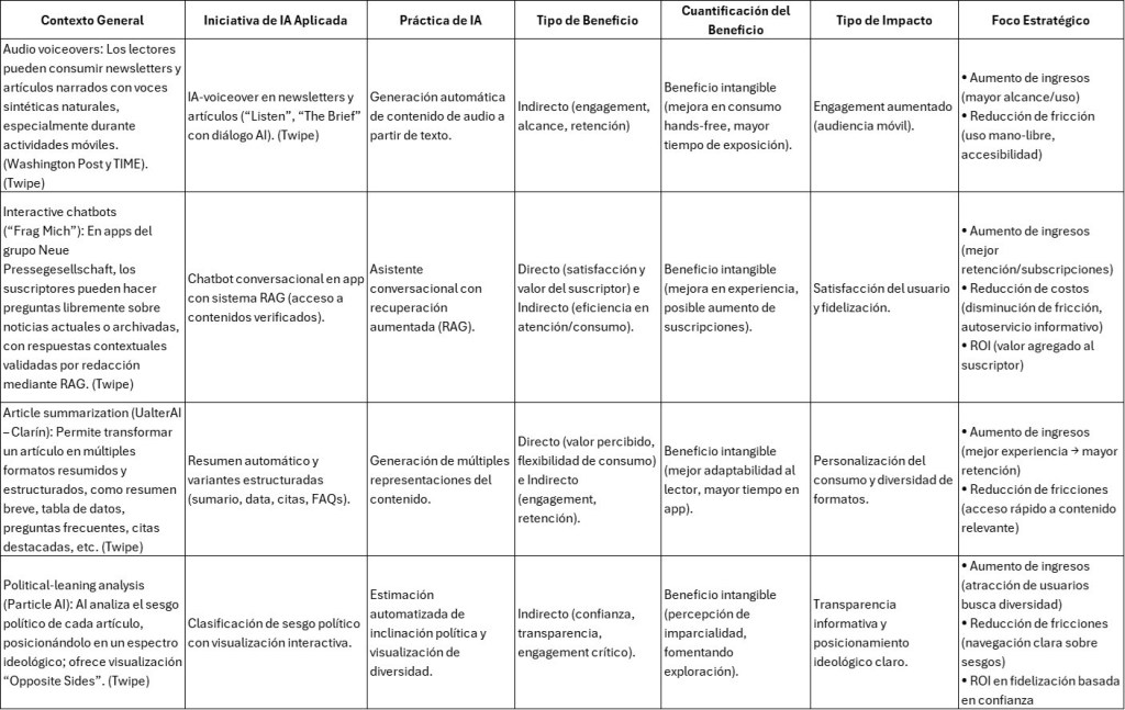 En un contexto donde los medios de comunicación buscan desesperadamente nuevas formas de fortalecer la relación con sus audiencias y hacer sostenibles sus modelos de negocio, la Inteligencia Artificial emerge como una aliada estratégica más que como una simple herramienta. Un reciente artículo de Twipe, titulado «4 ways news publishers are bringing AI into their apps« expone iniciativas concretas implementadas por medios como el Washington Post, Clarín y grupos editoriales europeos, que están integrando soluciones de IA directamente en sus aplicaciones móviles. Lo que sigue a continuación no es solo una tabla, sino un marco analítico que traduce esas acciones en impacto estratégico real, utilizando criterios financieros, de negocio y de retorno sobre inversión, tal como lo propone mi método.