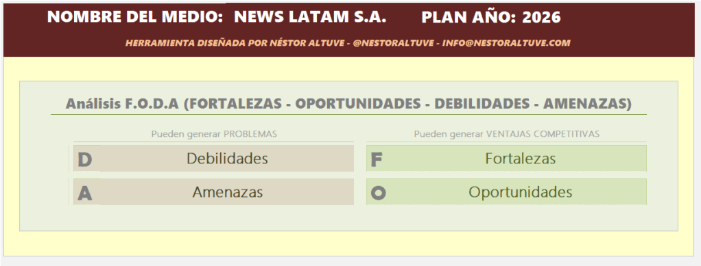 Una herramienta práctica diseñada por Néstor Altuve para que los medios de comunicación integren la inteligencia artificial en su análisis FODA y construyan su estrategia 2026 con claridad y visión – Descárgala AQUI