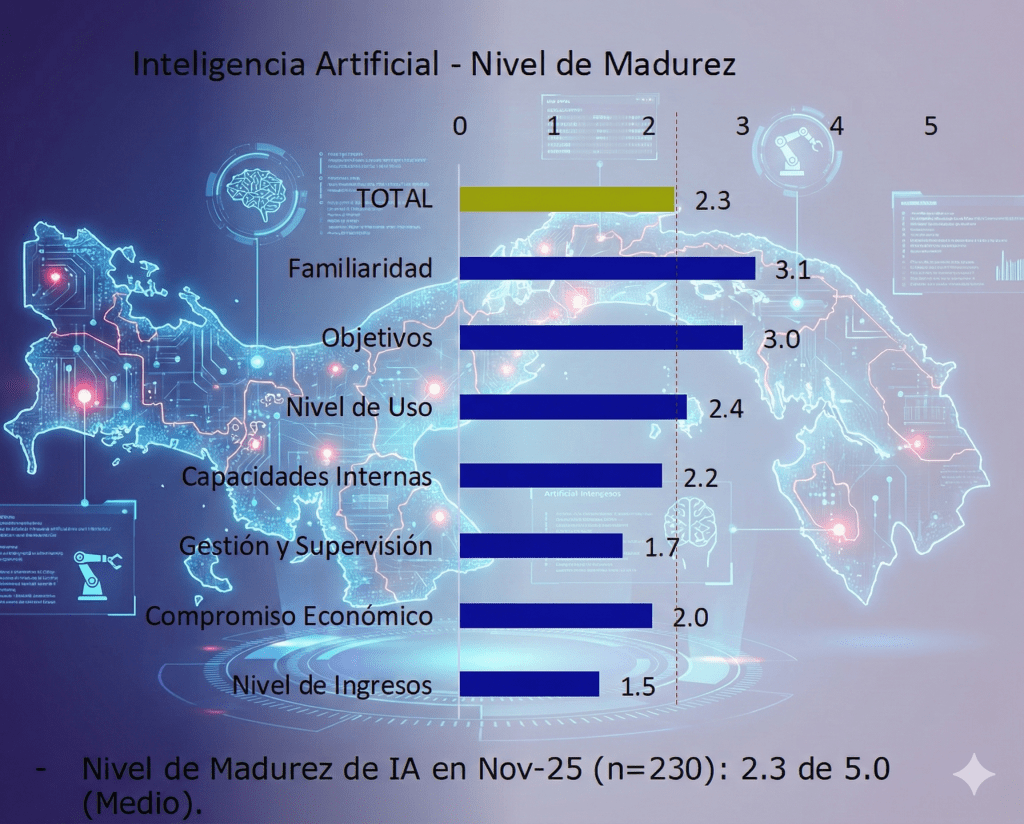 Un reciente informe de la consultora Elemente, basado en 230 organizaciones de Panamá, sitúa la madurez promedio de la IA en 2.3 sobre 5, un nivel medio que confirma avances, pero también límites evidentes. La mayoría de las empresas entiende qué es la IA y la utiliza para ganar eficiencia, pero su uso sigue siendo parcial, con baja inversión, escasa gobernanza y una contribución mínima a los ingresos. La IA está presente, sí, pero aún no es estratégica.