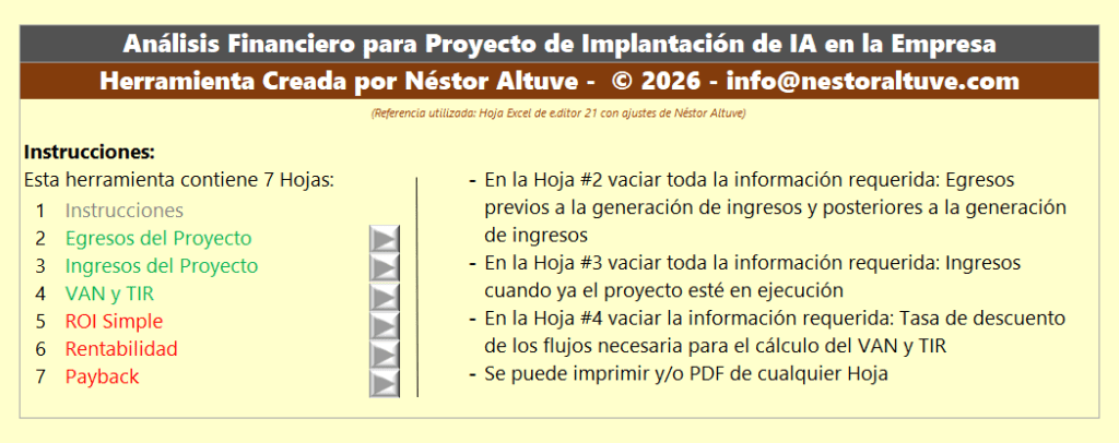 La herramienta “Análisis Financiero para Proyecto de Implantación de IA” no es una hoja de cálculo más. Es un marco estructurado para traducir tecnología en números. Y números en decisiones.