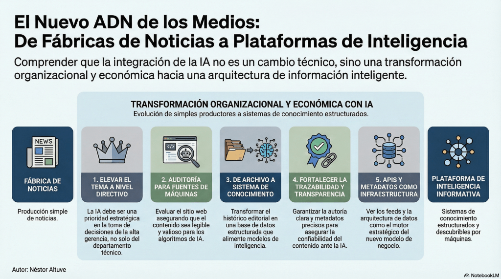 Para los medios, esta conversación llega en un momento delicado: ingresos presionados, audiencias fragmentadas, dependencia de plataformas y necesidad urgente de construir ventajas que no se evaporen con el siguiente cambio del algoritmo. Precisamente por eso, ordenar la arquitectura editorial para sistemas de IA no es una tarea cosmética. Es una inversión en capacidad de descubrimiento, autoridad y futuro.